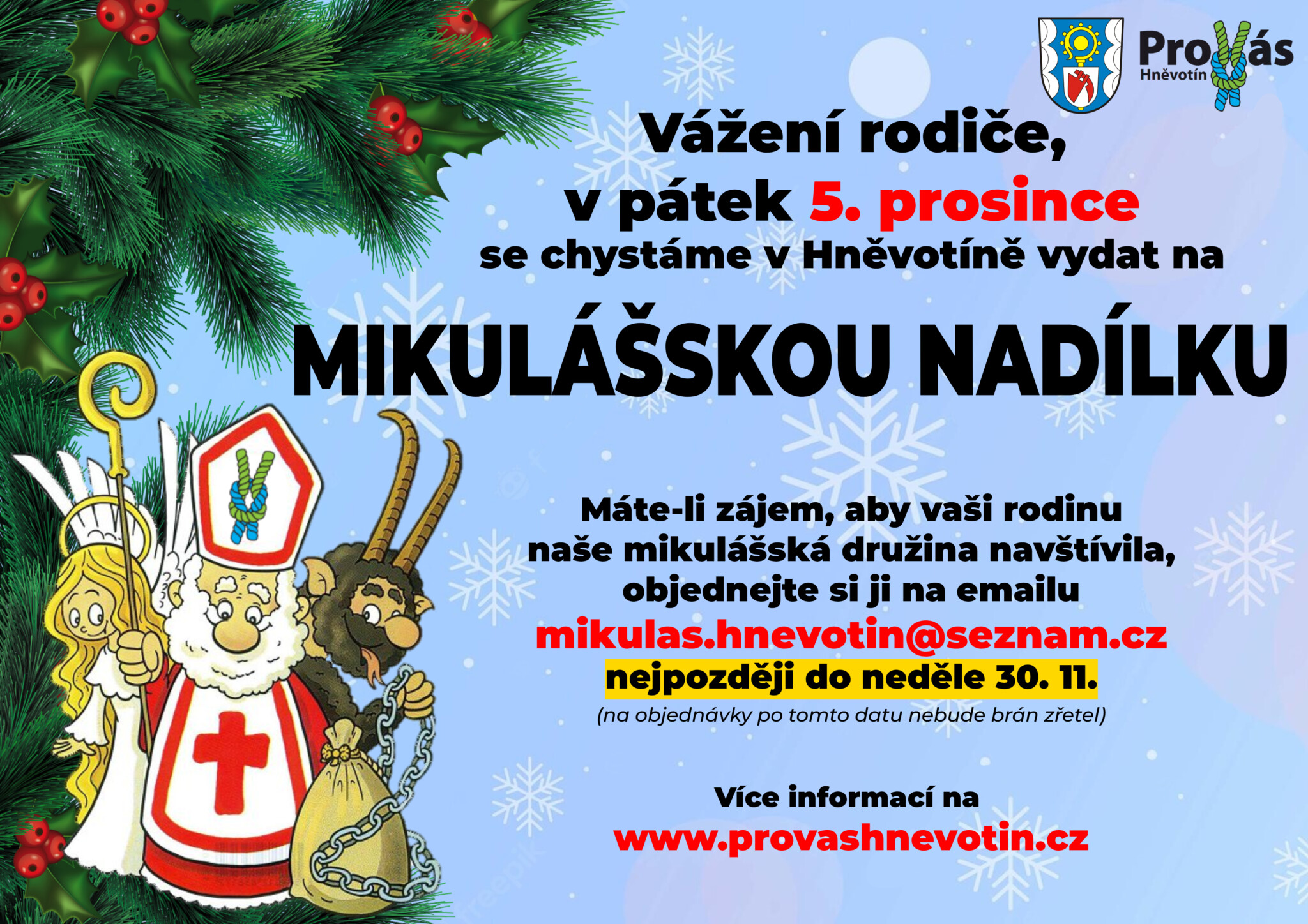 Stejně jako v minulých letech, i letos přicházíme s nabídkou návštěvy Vaší hněvotínské domácnosti Mikulášem a jeho družinou. Máte-li zájem, postupujte dle následujících pokynů: Na emailovou adresu mikulas.hnevotin@seznam.cz nám nejpozději do neděle 30. listopadu 2025 zašlete následující informace: